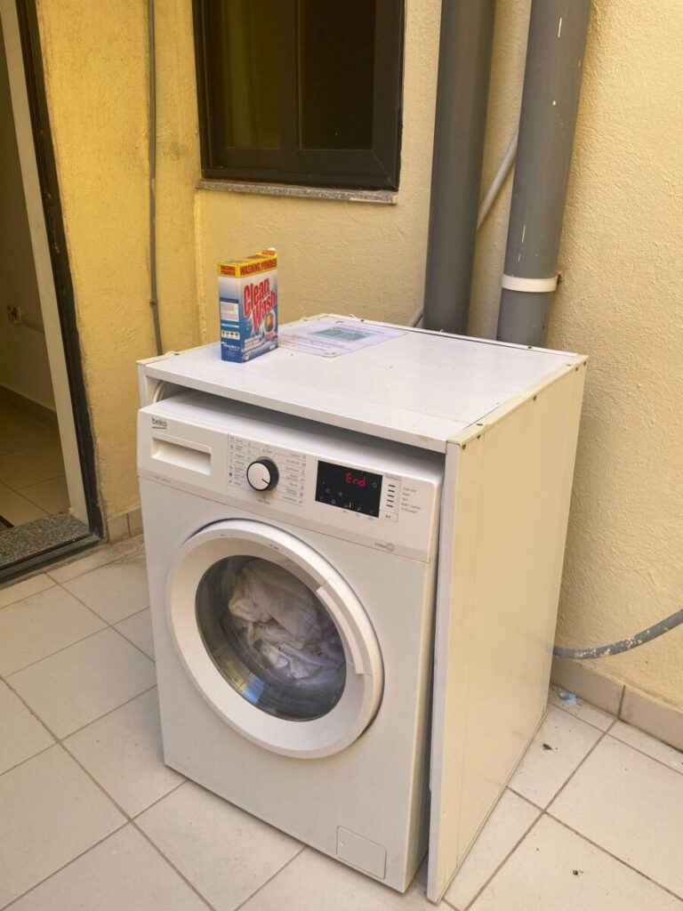 洗濯機は外のバルコニーにございます。干す場所もございますので、便利です!