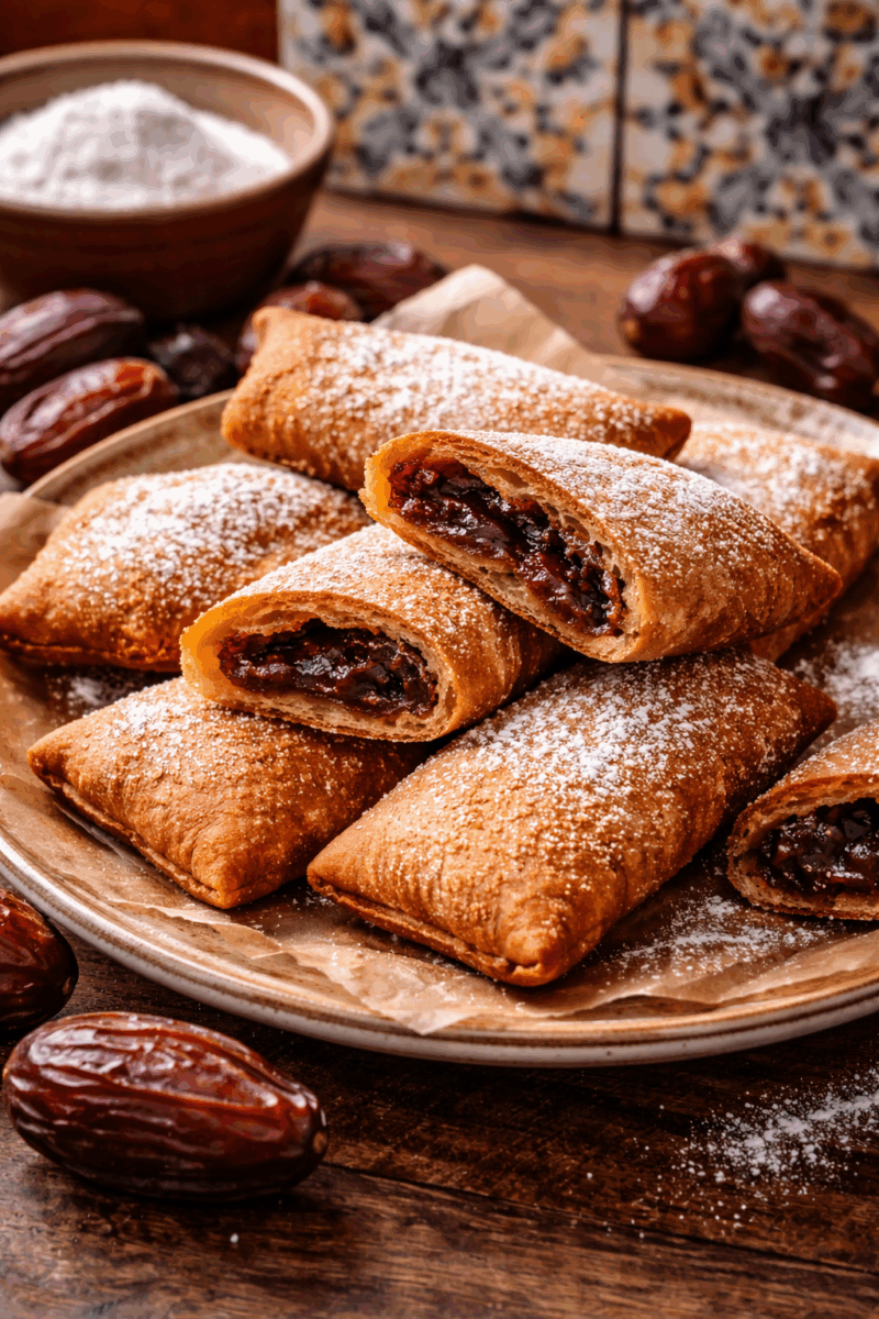 デーツのフィリングを包んで揚げたお菓子で、糖蜜とスパイスを煮詰めた、ほろ苦さの残る甘さが特徴です。