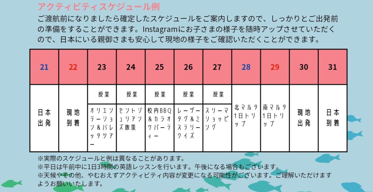 | 料金に含まれるもの | 日本からマルタへの往復引率 英語レッスン(週15時間) 滞在費(学生寮4人部屋) 食費(1日3食) アクティビティ |