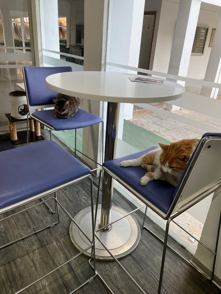 こちらはマルタ大学内で撮ったお写真とのこと。なんと!?猫ちゃん達がくつろぎきっています…!!
