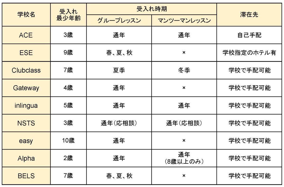各学校でお子様の受け入れ可能な年齢が異なります。また、その時の学校の予約状況によって、Kidsコースの人数が少ない場合には、開講されなかったり、レッスン数が減少する場合がありますので、渡航時期やご希望をお知らせ頂き、学校に問い合わせをしますので、まずはご相談ください。